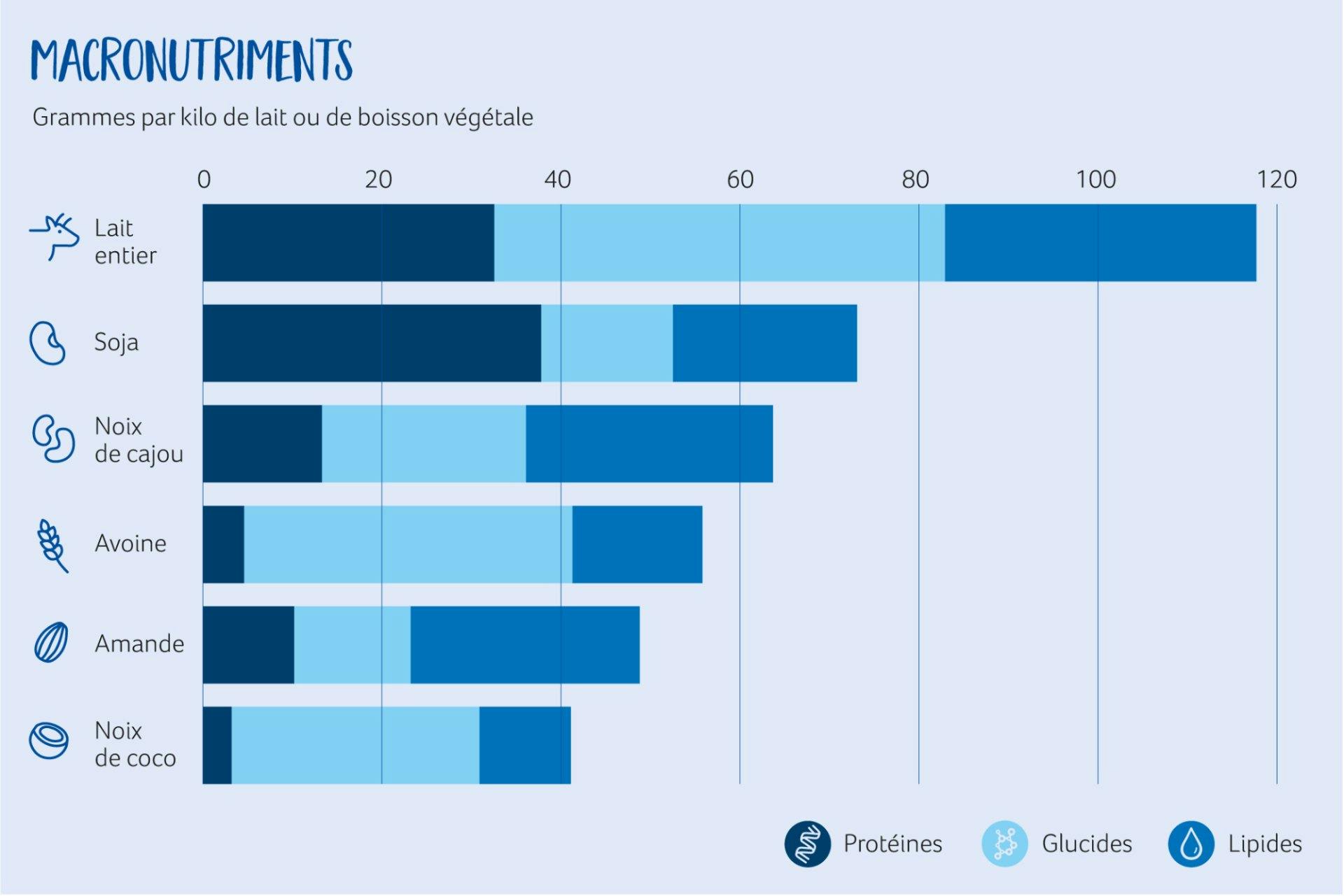 Qu’en est-il des glucides? Le lactose contenu dans le lait fait augmenter la glycémie plus lentement que le sucre contenu dans la plupart des boissons végétales. Les graisses et les protéines du lait contribuent, elles aussi, à ralentir la hausse de la glycémie. Les boissons végétales ne contenant pas de lactose, elles sont bien supportées par les personnes intolérantes. Saviez-vous qu’il existe également du lait sans lactose? Il est ainsi possible de profiter de la diversité nutritionnelle du lait tout en évitant les troubles digestifs.
