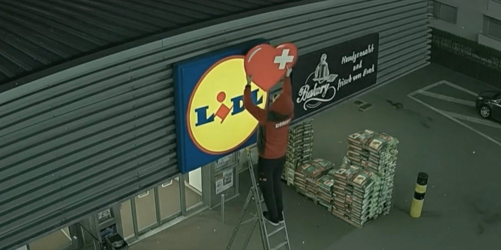 Que ce soit sur le site Internet, sur le prospectus publicitaire ou sur les affiches de Lidl, on ne trouve plus le cœur suisse. Des rumeurs circulent depuis un certain temps déjà sur les dessous de cette affaire. Mais un vol inhabituel vient éclairer la situation: des caméras de surveillance ont immortalisé cet incident étrange. Au petit matin, un voleur cagoulé escalade une échelle avec un objectif clair: subtiliser le cœur suisse du logo Lidl.